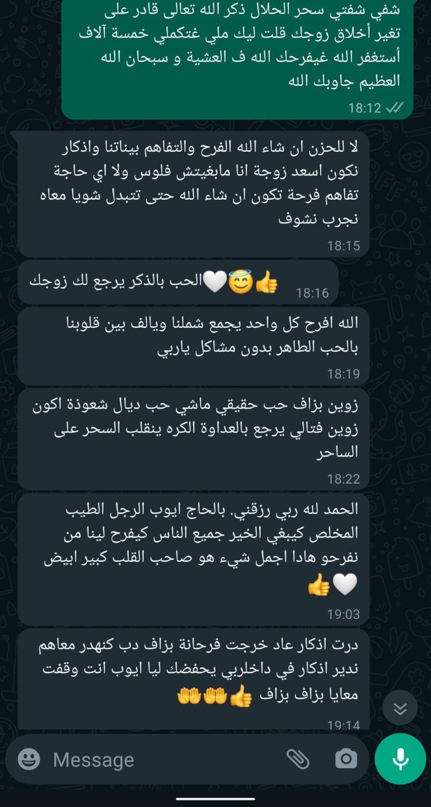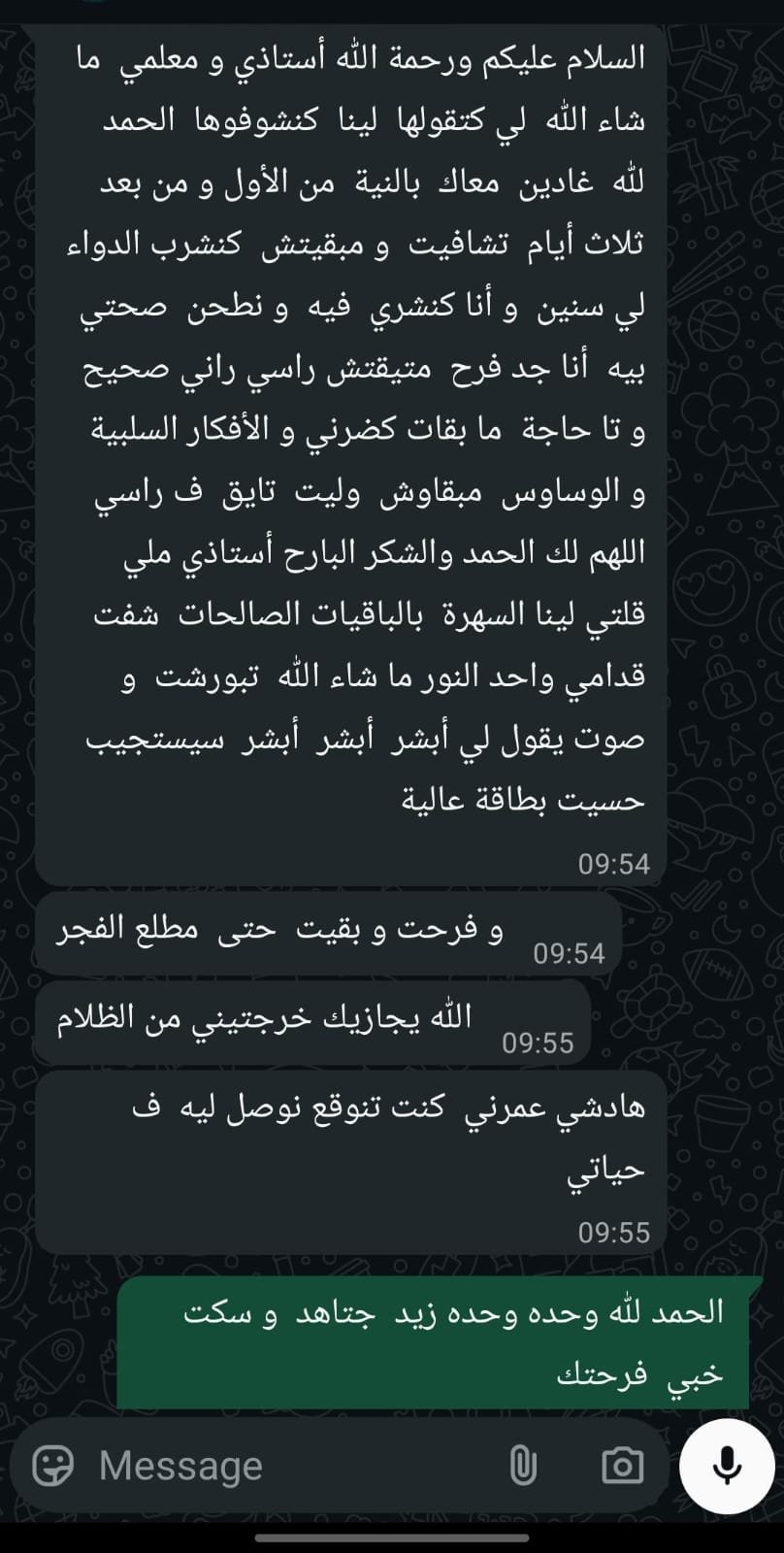 الحاج محمد أيوب هو معالج روحي ونفسي متخصص في الدعم النفسي والروحي بطريقة آمنة وفعّالة عبر الهاتف. يساعد الأشخاص على استعادة توازنهم النفسي والروحي والشفاء التام من القلق والاكتئاب و المس و السحر و الطاقة السلبية مع تحقيق التوقف الجذري عن الاعتماد على الأدوية خلال ثلاثة أيام وفق الحالة الفردية لكل شخص.